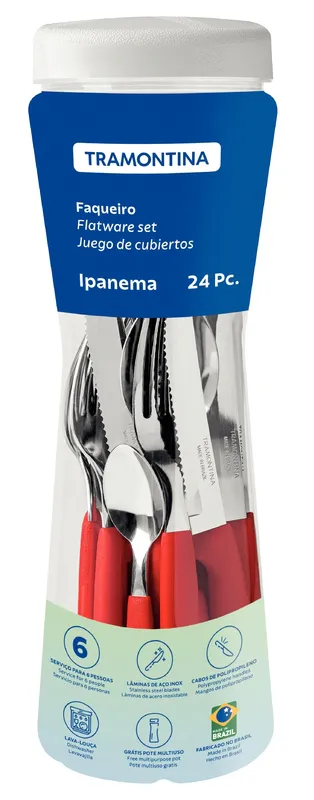 Faqueiro Ipanema com Lâminas em Aço Inox e Cabos de Polipropileno Vermelho com Pote Plástico Tramontina 24 Peças